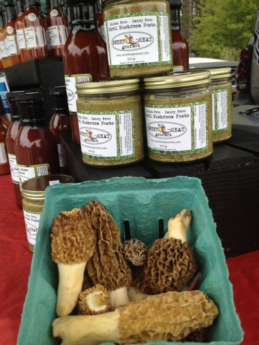 We are making a gluten free, dairy free pesto right now. We had a Morel Mushroom Pesto, but we sold out this week. However, our Farmer’s Market Pesto, we have ingredients from Clan Stewart Farm, Greenmoore Gardens, Jade Family Farm, and Full Circle Farm. All of our hot sauces are made with super hot peppers grown in State College from Exotic Peppers. Mel and Pablo, who run the business, grow the peppers here, and we are huge supporters of them. We also get a lot of produce from Chuck and Marie from Mothersbaugh Farm, and we get apples from Way Fruit Farm. What we do is go around toward the end of the market, and see what’s in season and talk to the farmers and buy what we can that they’ve brought to the market. Some of the farmers this year, such as Clan Stewart and Mothersbaugh, asked us what in particular we’d like to have grown, and are growing plants specifically for our products, which is pretty cool!