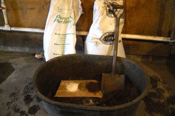 High-tech infrastructure for making seed-starting mix: perlite, vermiculite, and peat on cardboard. Photo Credit James Eisenstein.