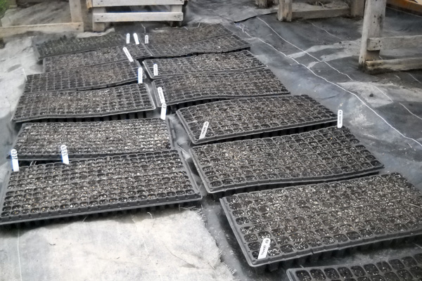 Some of the seeded flats awaiting germination in the greenhouse. Photo Credit James Eisenstein.