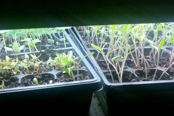 Seedlings growing under shop lights in cell flats. Photo Credit Jamie Oberdick.