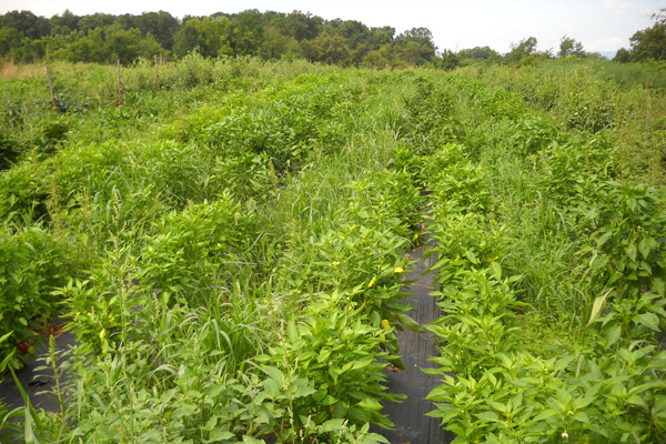 Wait, you say, the weeds are as big as ever. Yes, food fans, they were. It turns out weeds grow – and faster than most crops. What you see are the weeds that grew up between the rows of peppers, which are almost as pernicious as those growing cheek by jowl with the plants. Three hours with a lawn mower operated by an unpaid field hand, and the field is restored to its former glory.