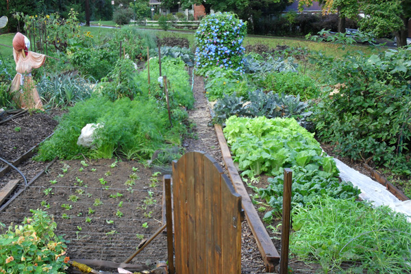 First, an invitation to imagine. Consider a community where the grass lawns of churches, corporations, schools, government buildings, and apartments are instead well-loved, well-tended and bountiful vegetable gardens. Fruiting bushes and trees can be found in grass strips and wedges alongside roads. A place where the thoughtful harvest and storage of water draining off of structures (buildings, parking facilities, all manner of roofs) ensure that these gardens receive adequate watering. A place where a deep appreciation for the well-being of soil (through composting practices) is matched equally by a great affection for the many creatures (pollinators, predator insects, songbirds, et al.) which make its life both possible and more beautiful. And, finally, imagine the people in this community wholeheartedly related to their food—to its cultivation, its harvest, its preparation, its shared enjoyment.