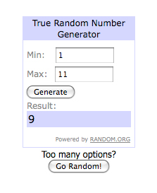 The winner was chosen using a random number generator. Congratulations, Destiny!